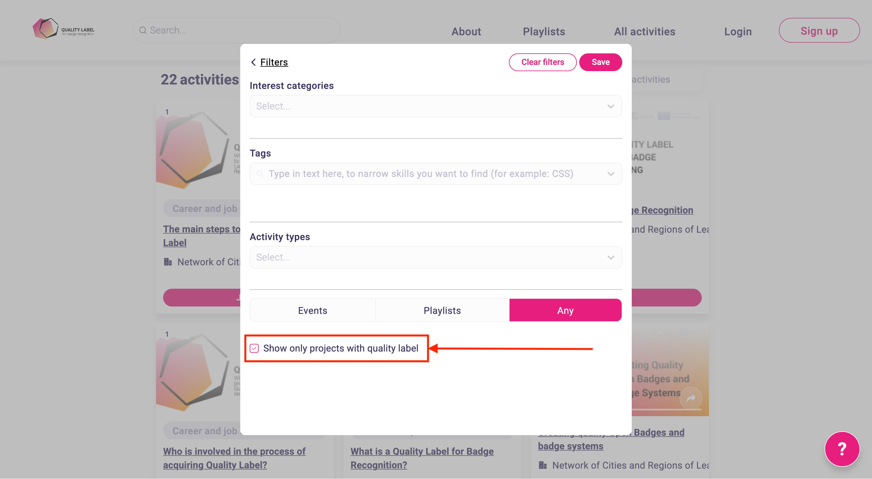 Users can filter for activities/playlists organised by Organisers awarded the Quality Label.
